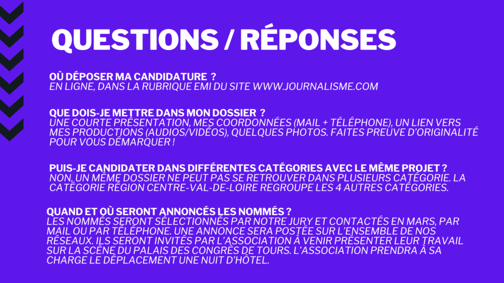 Les lauréats repartiront avec un chèque de 1500 euros grâce aux 5 parrains des Prix : La Fondation TF1, France Médias Monde, le Ministère de la Culture, Réseau Canopé – le CLEMI et la Région-Centre-Val-De-Loire !